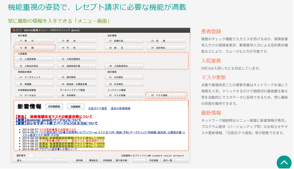 ORCA(オルカ)とは 日医標準レセプトソフト「ORCA(オルカ)」は、日本医師会が提供する 日本の医療現場のためのレセプトコンピュータ(以下レセコン)です。